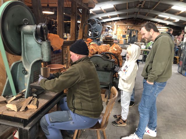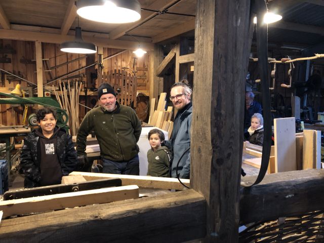 In der Schreinerei durften die Kinder selbst Hand anlegen: an der historischen Bohrmaschine wurden Löcher fachmännisch (und unter Aufsicht) gebohrt,