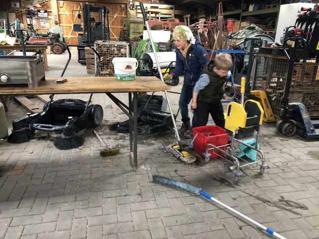 Auch mit der Kehrmaschine wurde fleißig gearbeitet und das anschließende Säubern der "Kehrer" (Mensch und Maschine) sorgte für besonders viel Spaß.